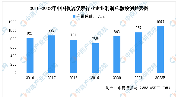 其增長速度整體而言高于主營收入的增長速度,說明我國儀器儀表行業(yè)的盈利能力不斷提升,已步入高質(zhì)量發(fā)展階段。中商產(chǎn)業(yè)研究院預測,2022年我國儀器儀表行業(yè)企業(yè)利潤總額將達1097億元。